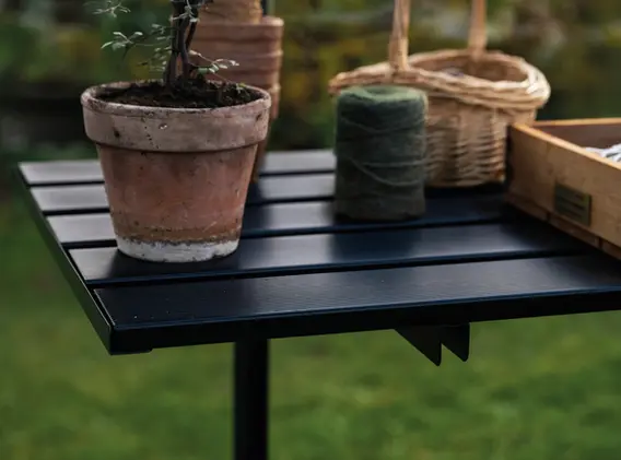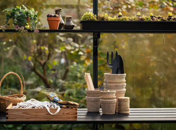 Fie că este vorba de pre-cultivare, schimbarea anotimpurilor sau recoltare, raftul integral cu lamele oferă spațiu pentru ghivece, tăvi, mănuși, sfoară și unelte. În combinație cu cârlige, suporturi pentru ghivece și rafturi suplimentare, puteți păstra sera organizată: totul are locul său și este la îndemână.
