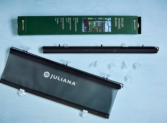 Setul este format din 2 jaluzele negre cu role de 67,5 cm lățime x 205 cm lungime. Jaluzelele se atașează pur și simplu la geamul serei cu ajutorul ventuzelor. Potrivite pentru serele cu geam cu lățimea de 700 mm și pentru gama de sere Juliana.